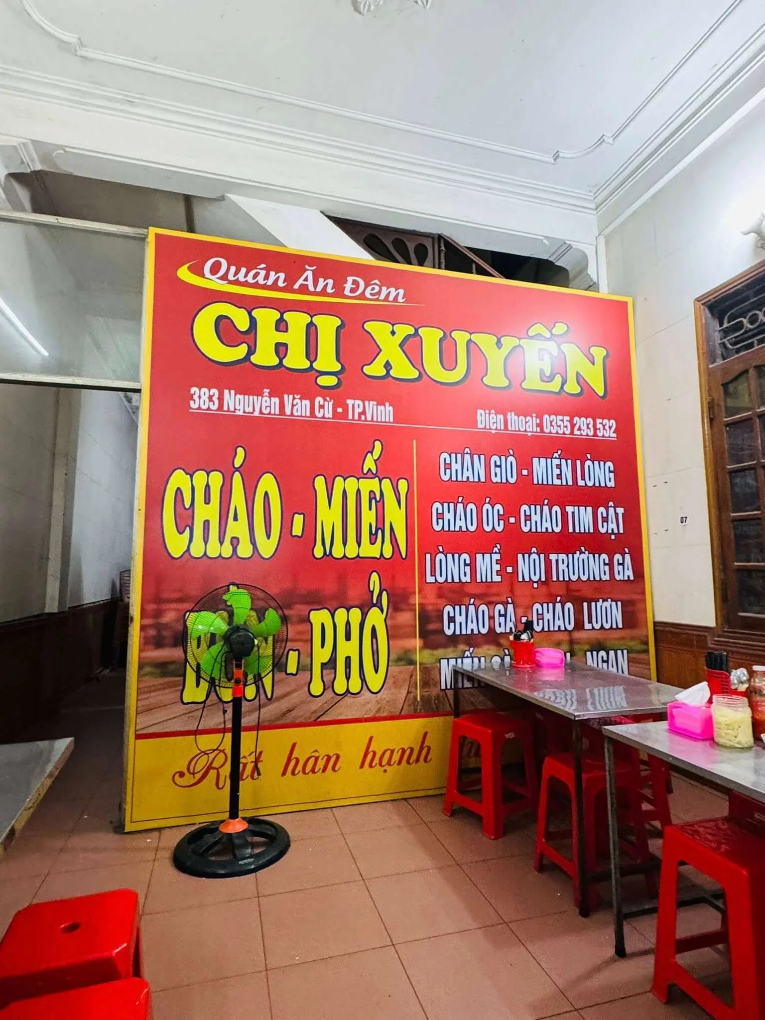 Tọa lạc tại 383 Nguyễn Văn Cừ, Quán Chị Xuyến là một địa chỉ ăn đêm quen thuộc, phục vụ đa dạng các món ăn nóng hổi. Với thực đơn phong phú từ phở, bún, cháo, súp đến các món đặc trưng như gà bóp và miến trộn, đây là một lựa chọn đáng tin cậy cho một bữa ăn khuya chất lượng.