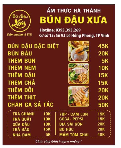 Tọa lạc tại một trong những con đường sầm uất nhất thành phố Vinh, Bún Đậu Xưa tại 93 Lê Hồng Phong là điểm đến không thể bỏ lỡ cho những tín đồ của ẩm thực Hà thành. Nếu bạn đang tìm kiếm một nơi để thưởng thức một mẹt bún đậu đậm đà, chuẩn vị trong một không gian gợi nhớ về những ngày xưa cũ, thì đây chính là lựa chọn hoàn hảo.