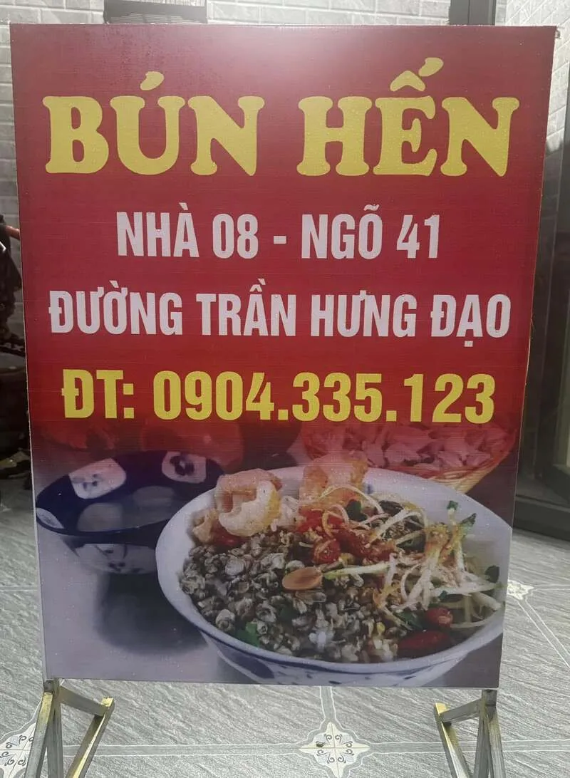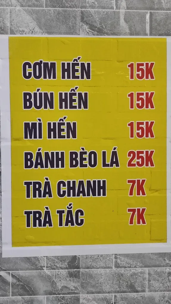 Thực đơn của quán tập trung vào các món hến đặc trưng của xứ Huế:
