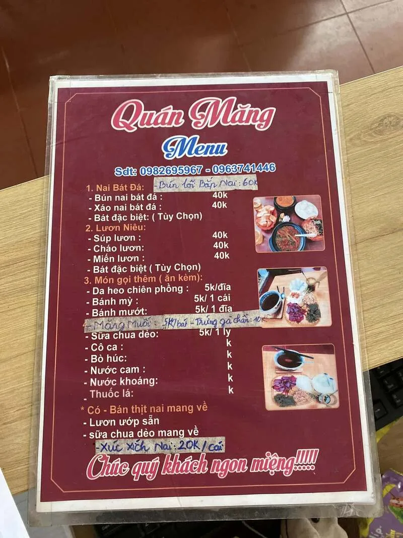 Là một địa chỉ ẩm thực độc đáo và khác biệt, Quán Măng gây ấn tượng mạnh với những món ăn "độc quyền" chưa từng có tại Vinh. Nổi bật nhất là món Lươn né sốt tiêu đen và Bún/Nai thố đá nóng hổi, quán mang đến một trải nghiệm ẩm thực mới lạ, kết hợp giữa đặc sản xứ Nghệ và phong cách chế biến sáng tạo.