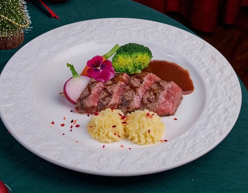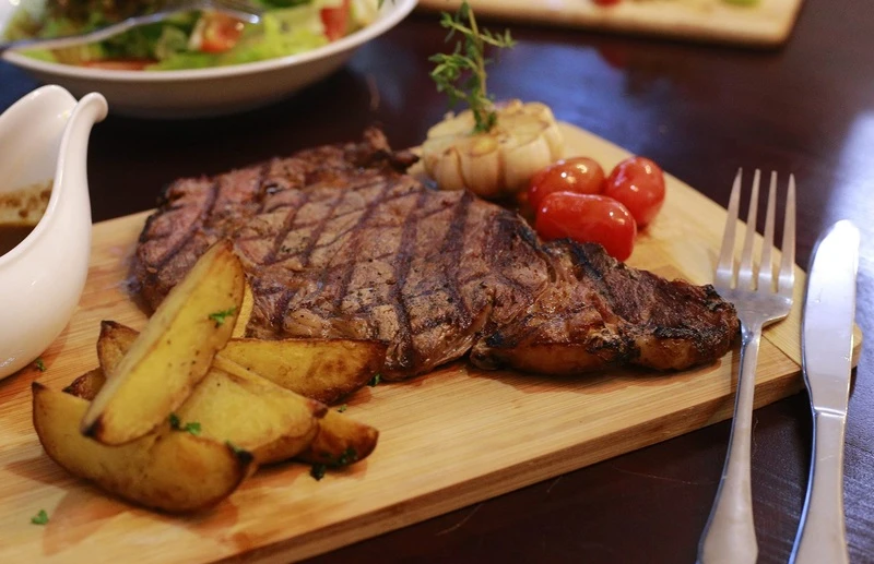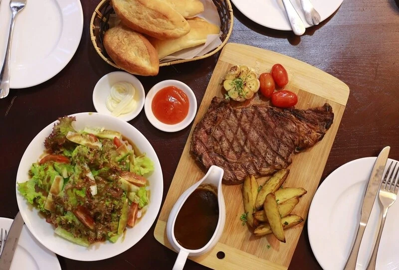 Món "đỉnh" tại đây là Beef Rossini (Bít tết Pháp thượng hạng) - một kiệt tác kết hợp giữa bò Wagyu nướng than mọng nước, gan ngỗng béo ngậy tan chảy, nấm Truffle quý giá và sốt rượu vang tinh tế. Bên cạnh đó, các món như thịt xông khói gỗ sồi kiểu Texas hay sườn cừu cũng rất đáng thử. Đừng quên nhờ Sommelier (chuyên gia rượu) tư vấn một ly vang từ bộ sưu tập phong phú (Pháp, Ý, Chile...) để hương vị thêm trọn vẹn.
