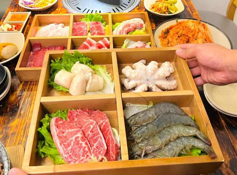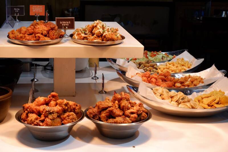 Thịt nướng tại Itaewon ghi điểm nhờ sự đa dạng của các loại sốt ướp đậm đà theo công thức Hàn Quốc. Khi nướng trên bếp than hồng, thịt dậy mùi thơm phức, ăn kèm với quầy line đồ chiên nóng hổi được bổ sung liên tục.