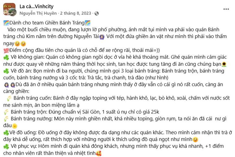 Bài đánh giá về bánh tráng trộn tại quán Chú Kim trong hội nhóm facebook
