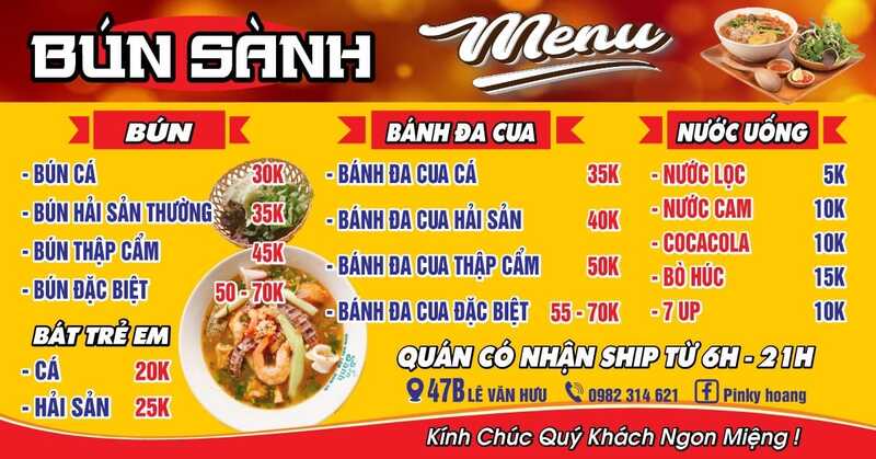 Menu quán bún Sành phong phú, đa dạng