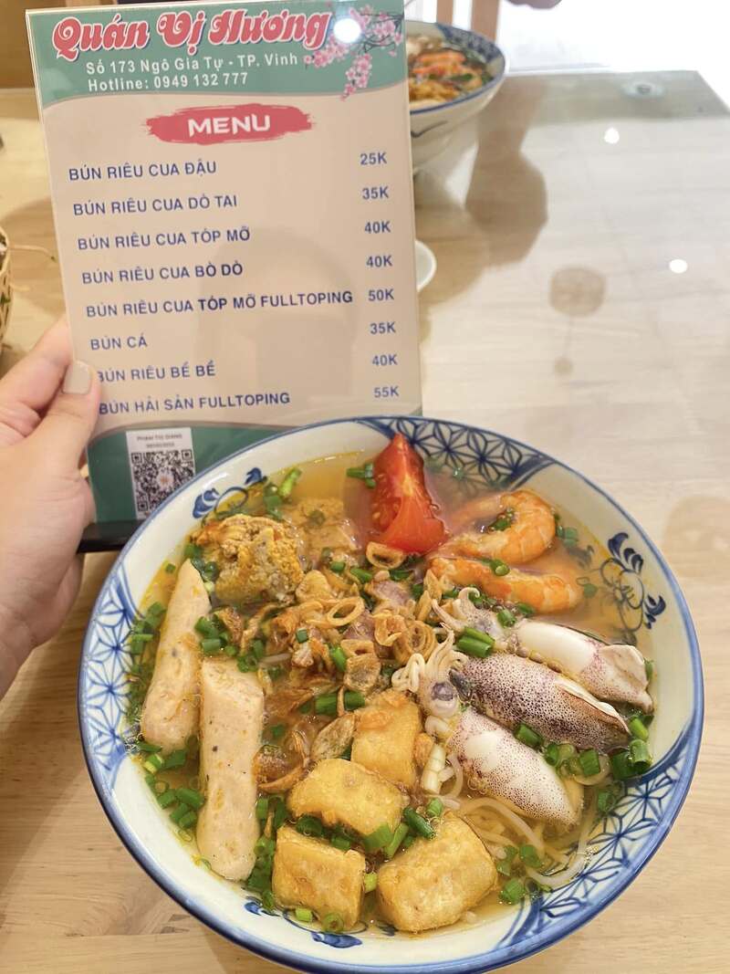 Đến quán, bạn sẽ được thưởng thức một bát bún hải sản nghệ an nóng hổi giàu dinh dưỡng. Chỉ với 55 .000 đồng, bạn sẽ phiêu trong bát bún đầy ắp topping, tôm, mực, giò, cá với hương vị đậm đà khó quên…, đủ để một người lớn ăn no.
