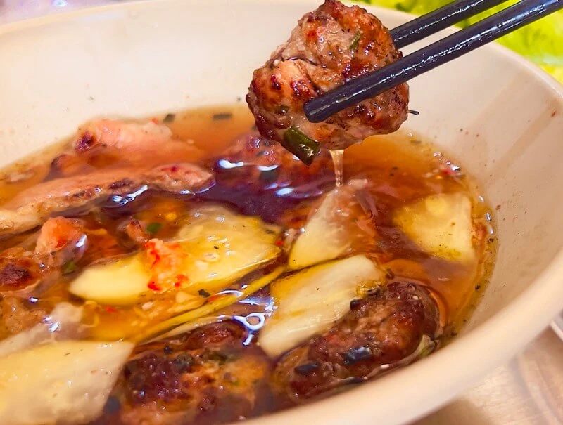 Cái hay của quán nằm ở chỗ thịt nướng vẫn giữ được cái hồn truyền thống: nướng trực tiếp trên than hoa nên miếng chả vừa mềm, vừa mọng nước lại thơm nức mũi, không bị khô như nướng lò điện. Nhưng "vũ khí bí mật" giữ chân khách lại là bát nước chấm nóng hổi được pha theo tỷ lệ vàng, chua ngọt thanh tao, thả thêm chút đu đủ, cà rốt giòn sần sật thì đúng là "chân ái" cuộc đời.