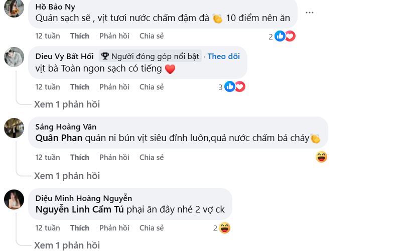 Quán Vịt Cỏ Bà Toàn là một trong những quán bún vịt tp Vinh nổi tiếng . Món bún vịt trộn ở đây có hương vị đậm đà, nước mắm gừng pha chuẩn, làm nổi bật hương vị thịt vịt cỏ dai ngon. Không gian quán tuy nhỏ nhưng sạch sẽ và thoáng đãng, phục vụ rất chu đáo. Đây là điểm đến lý tưởng cho những ai muốn thưởng thức món bún vịt chuẩn vị Vinh.
