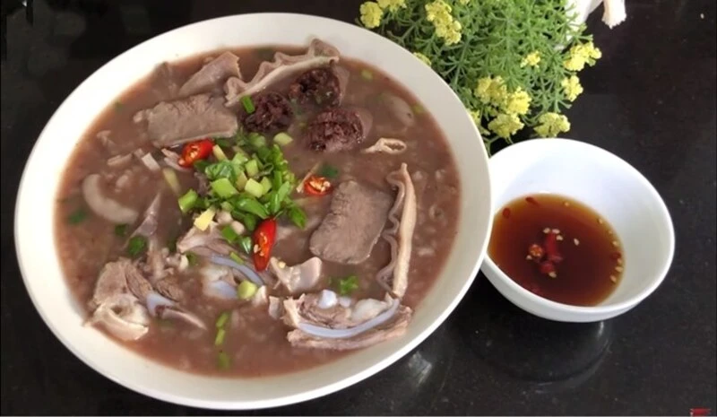 Cháo lòng ở đây nấu theo lối xưa, nước dùng ngọt lịm từ xương và tiết, mang màu nâu sóng sánh hấp dẫn. Lòng lợn được xử lý cực sạch, không hề có mùi hôi, ăn giòn sần sật. Một bát cháo nóng hổi ăn kèm dồi trường, gan luộc chấm mắm gừng cay nồng là bữa sáng "vua" của dân lao động và người địa phương.