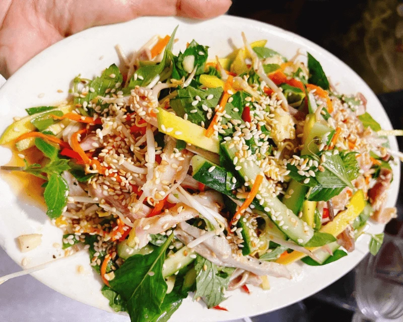 Món gỏi được đánh giá là "tròn vị" với sự cân bằng giữa chua, ngọt, cay nồng. Đặc biệt, món ăn đi kèm rau rừng tươi xanh chất lượng từ Tây Ninh và bánh mè nướng giòn rụm. Cách trình bày đẹp mắt, chỉn chu rất phù hợp cho các buổi tiếp khách.