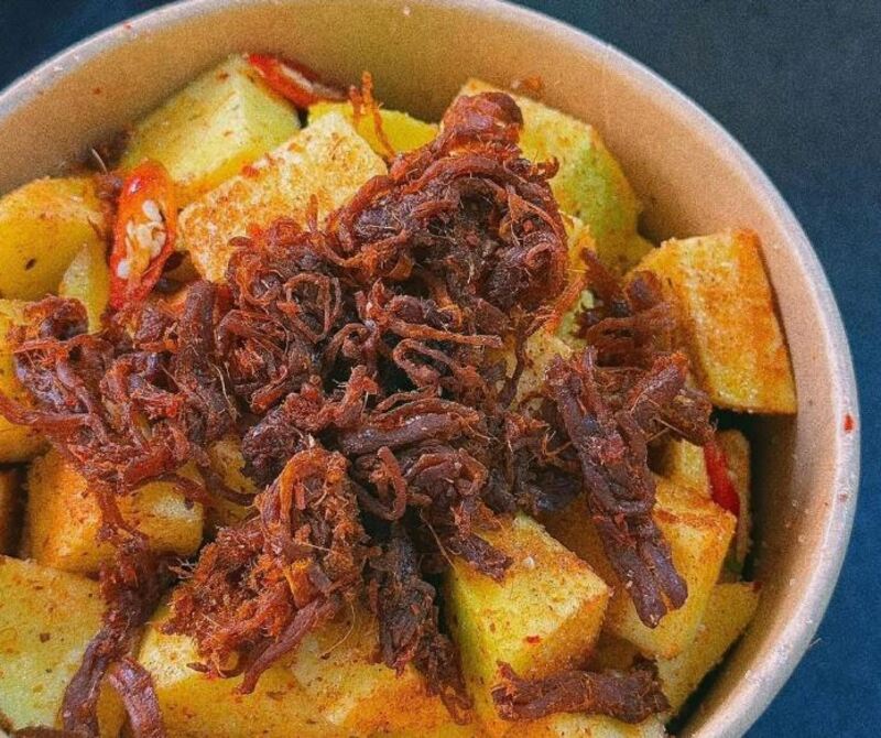 Đây là địa chỉ vỉa hè quen thuộc gắn bó với bao thế hệ người dân Vinh. Điểm sáng tạo khiến quán luôn đông khách chính là sự kết hợp táo bạo giữa hoa quả chua và đồ ăn vặt mặn: hoa quả dầm bò khô. Không cần cốt dừa béo ngậy, quán chinh phục thực khách bằng loại nước sốt chấm đặc trưng, tạo nên trải nghiệm vị giác mạnh mẽ và cực kỳ "bắt miệng".