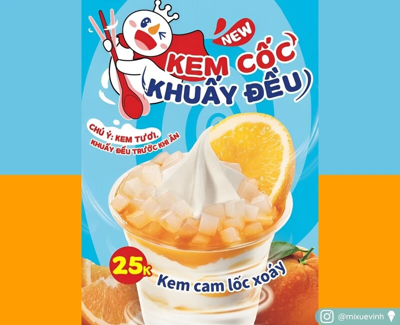 Thương hiệu kem "quốc dân" Mixue phủ sóng khắp Vinh với mức giá siêu rẻ, chỉ 10.000đ cho một cây kem ốc quế to bự. Năm 2025, Mixue cập nhật menu với dòng sản phẩm Cà phê kem tươi và Kem khoai môn tím béo ngậy, thơm mềm.