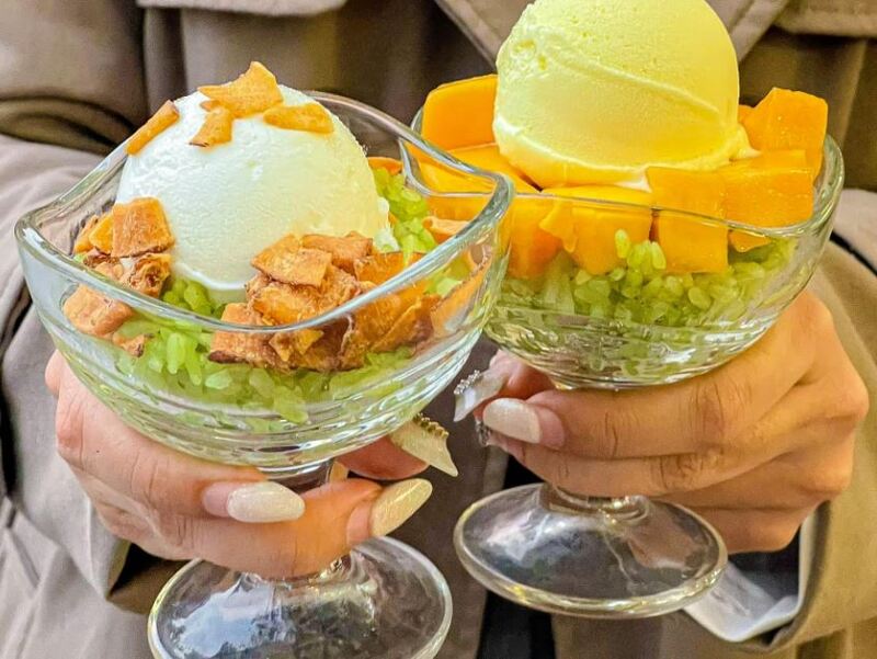 Tại Xiem Vinh, món kem xôi không còn giữ vẻ đơn sơ mộc mạc thường thấy mà đã được "biến hình" thành một phiên bản rực rỡ và lôi cuốn hơn mang tên Kem Xôi Mít Xoài.
