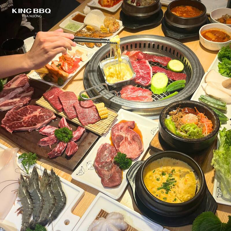 Nằm tại tầng 1 tòa nhà VRC, King BBQ là "anh cả" trong làng nướng Hàn Quốc tại Vinh với điểm nhấn là các loại thịt bò Mỹ, sườn heo được tẩm ướp nước sốt King độc quyền đậm đà khó quên. Điểm cộng lớn nhất là quầy line "khổng lồ" với hơn 200 món ăn kèm, món nóng, salad, súp và quầy tráng miệng với chè, kem tươi béo ngậy khiến thực khách mê mẩn.