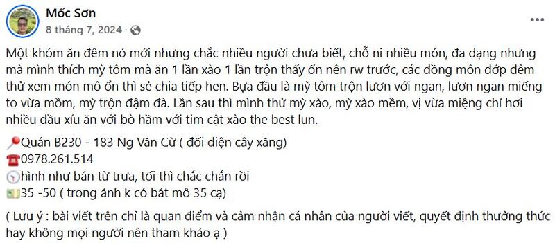 Với không gian rộng rãi và thoáng mát, Quán B230 là một nơi lý tưởng cho các cuộc gặp gỡ bạn bè hoặc gia đình. Dù quán có lượng khách đông nhưng phục vụ luôn nhanh chóng và nhiệt tình, giúp bạn có những trải nghiệm ẩm thực trọn vẹn.