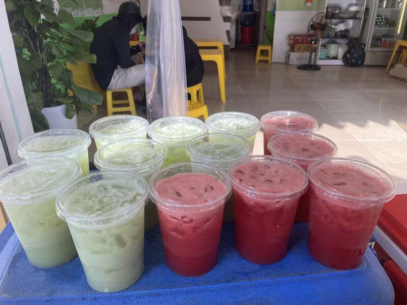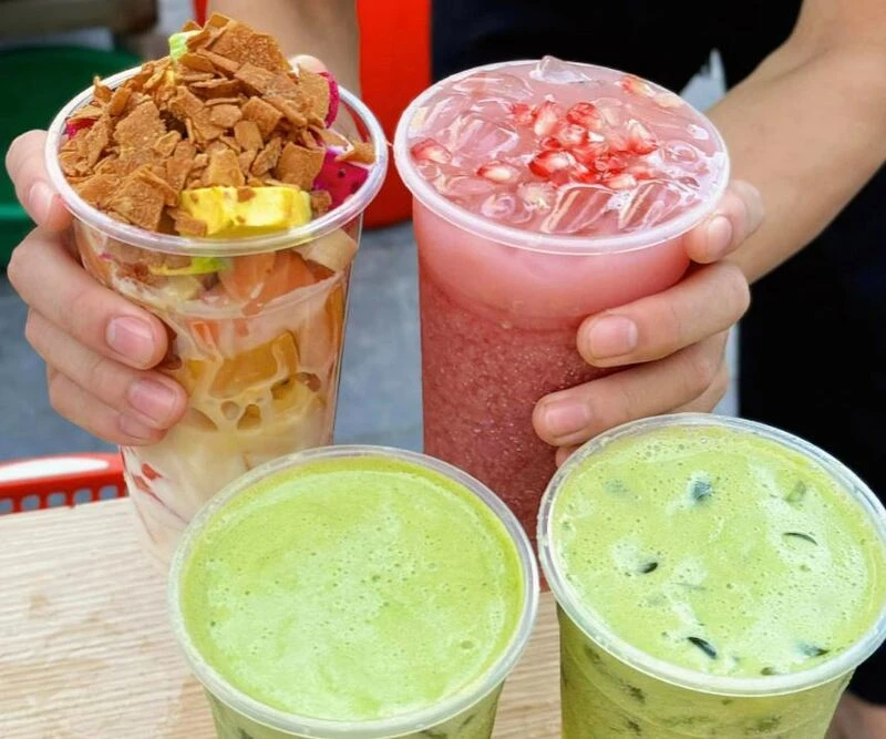 Điểm nhấn của nước ép tại đây nằm ở độ tươi và sự nguyên bản. Thay vì dùng siro hay nước đóng chai, quán ưu tiên ép trực tiếp từ trái cây tươi trong ngày như dừa, cam, dứa khi khách gọi món. Vị ngọt thanh khiết, không gắt đường giúp bạn bổ sung vitamin tức thì và thanh lọc cơ thể hiệu quả sau những bữa ăn vặt nhiều dầu mỡ.