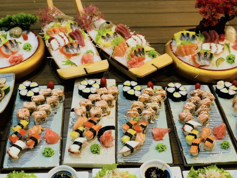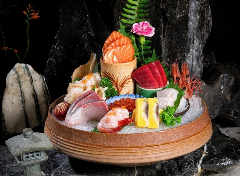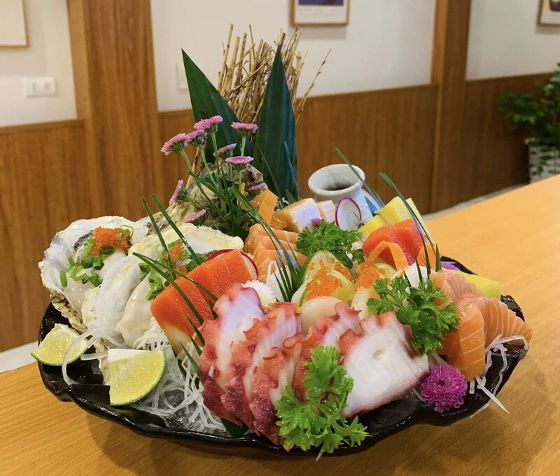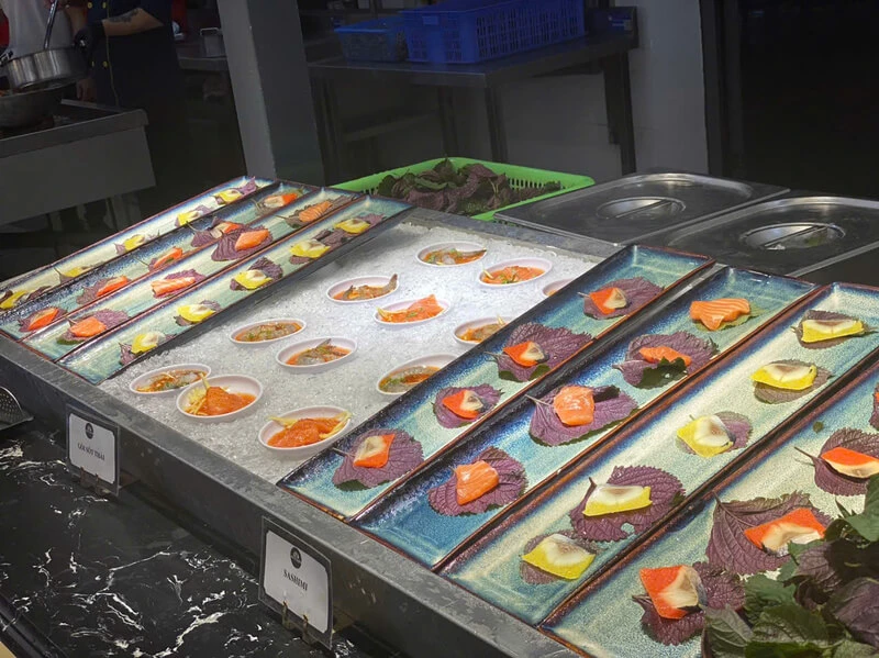 Nếu bạn muốn ăn sashimi trong một không gian tiệc tùng hoành tráng, Hải Vị Buffet là lựa chọn số 1. Nổi tiếng với hải sản tươi sống bắt tại bể, quầy sashimi tại đây cũng không hề kém cạnh với cá hồi, cá ngừ, bạch tuộc luôn được refill liên tục, đảm bảo độ tươi mới.