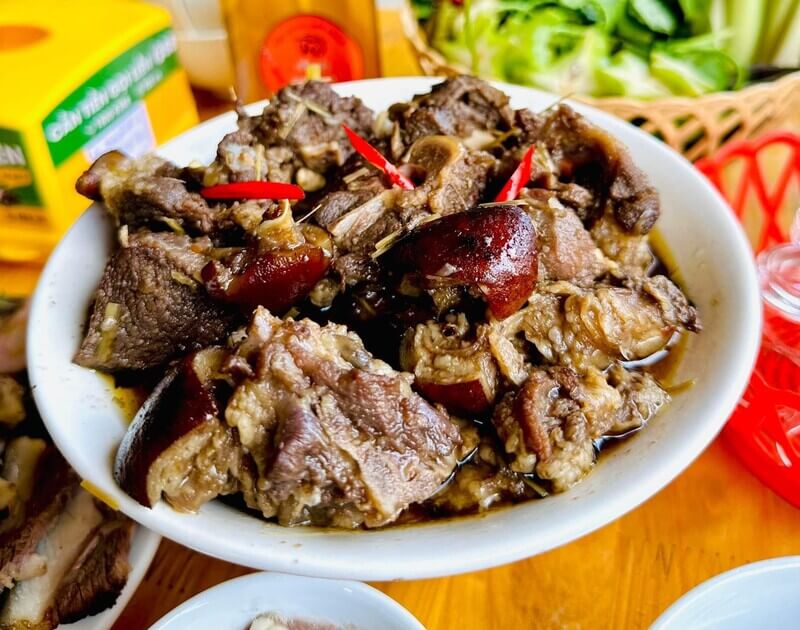 Thịt chó luộc tại đây được tuyển chọn tỉ mỉ loại nửa nạc nửa mỡ, tạo độ mềm ngọt và béo ngậy hòa quyện. Món "bát nấu" (rựa mận/xáo) ghi điểm vì toàn là thịt, thấm đẫm gia vị. Đặc biệt, món dồi chó ở đây có nhân dẻo, vỏ giòn, kết hợp với tỏi chiên ngoài giòn trong mềm ngọt cực kỳ cuốn miệng.