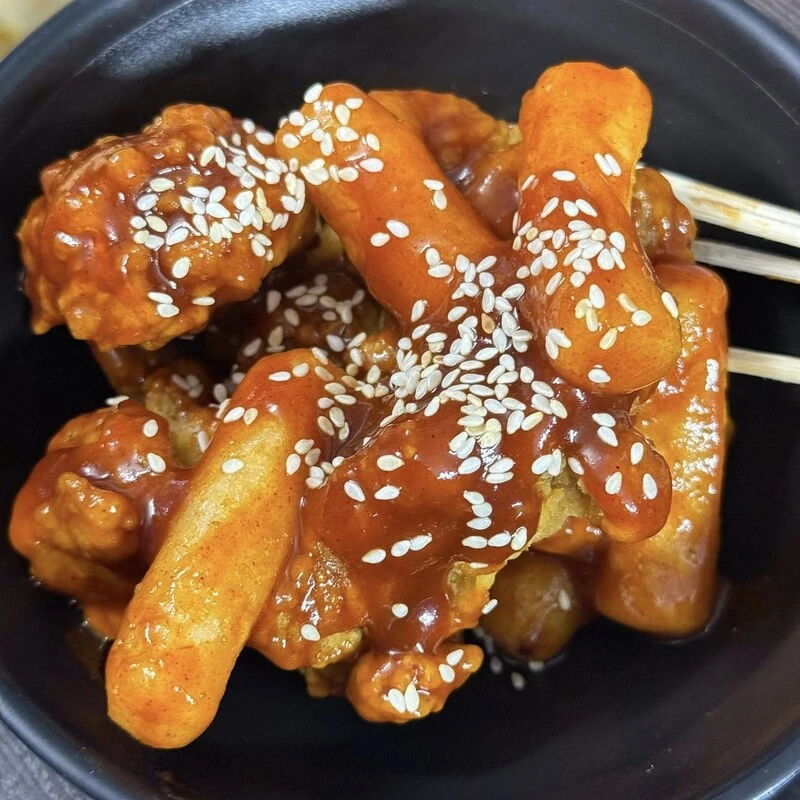 Ngoài ra, thực đơn gà rán với 6 vị sốt đặc trưng cũng là điểm nhấn không thể bỏ qua. Combo gà sốt và tokbokki tại đây được thiết kế hợp lý, giúp bạn vừa thưởng thức được gà giòn, vừa có bánh gạo dẻo dai mà không bị ngán.