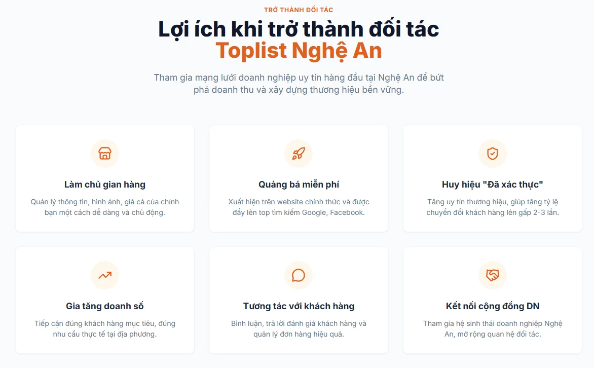Vì vậy chúng tôi triển khai chương trình "Đăng ký làm đối tác Toplist Nghệ An" nhằm hỗ trợ các bạn, để bắt đầu hãy click "Gửi thông tin doanh nghiệp ngay bên dưới" để bắt đầu chương trình đối tác.