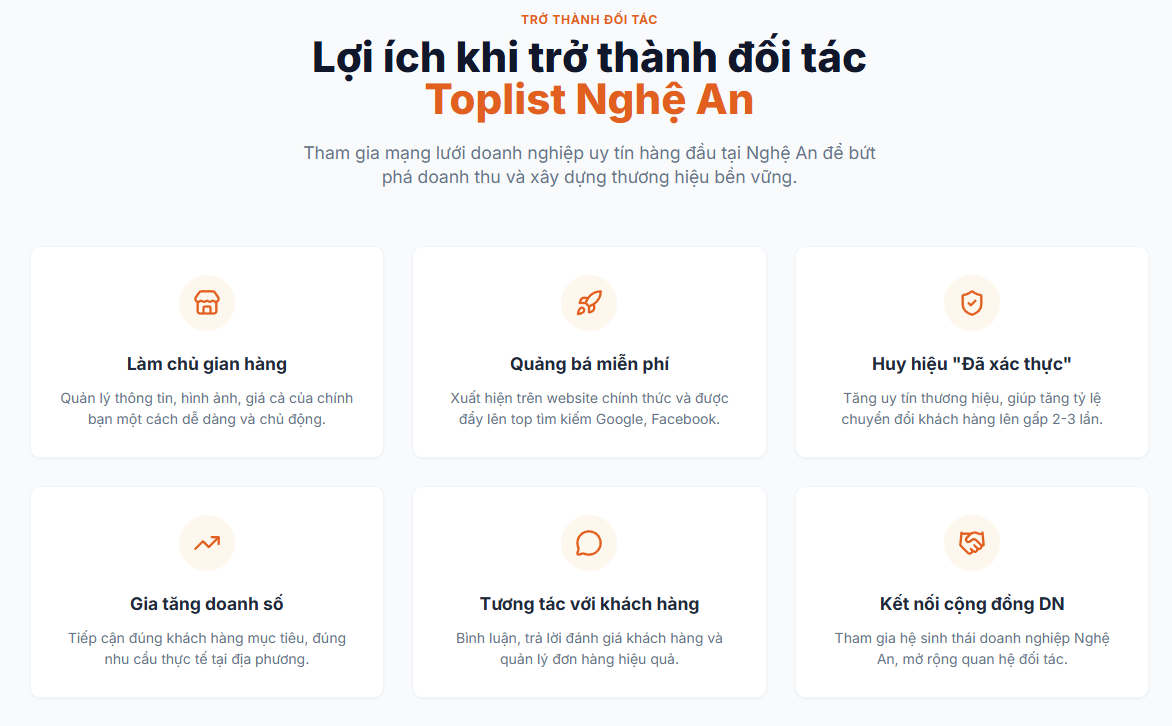 Trong thời đại công nghệ số phát triển mạnh mẽ, việc quảng bá doanh nghiệp trên nền tảng online là yếu tố then chốt giúp gia tăng doanh số và mở rộng khách hàng. Toplist Nghệ An mong muốn đồng hành cùng các doanh nghiệp, cửa hàng và dịch vụ địa phương — hỗ trợ quảng bá thương hiệu miễn phí, tiếp cận hàng nghìn khách hàng tiềm năng mỗi ngày.