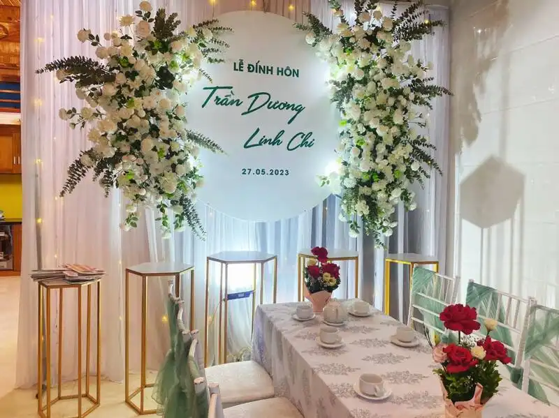Quy trình làm việc tại đây rất chặt chẽ: Khảo sát -> lên Maket chi tiết -> sản xuất riêng -> thi công đúng thiết kế. Đơn vị này có thể thi công giống 99% so với thiết kế 3D, giúp gia chủ và bố mẹ hai bên hoàn toàn yên tâm về sự chỉn chu và trang trọng trong ngày lễ ăn hỏi.