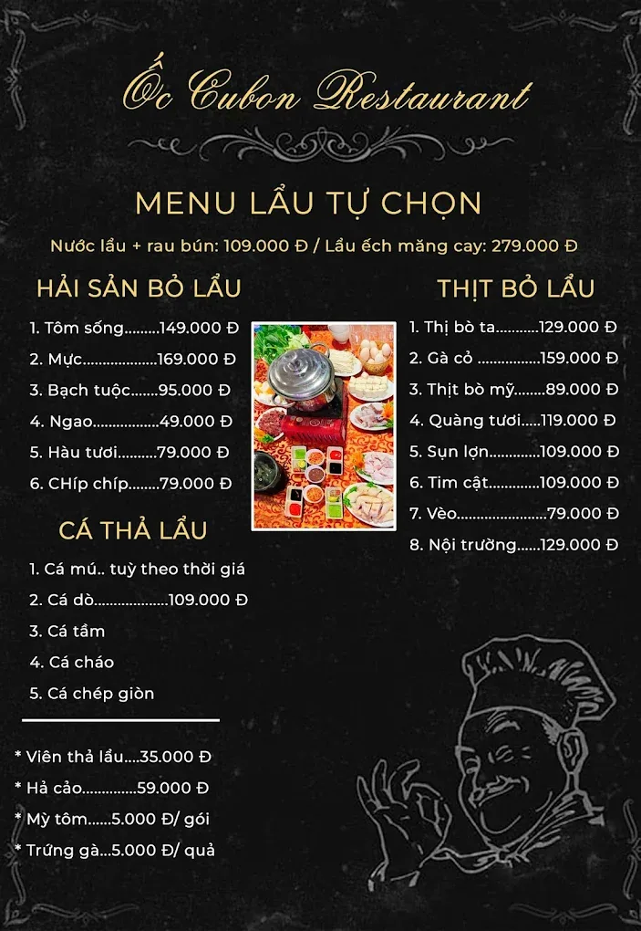 Với thực đơn lẩu tự chọn đa dạng, nguồn hải sản phong phú và các tiện ích như khu vui chơi trẻ em, Nhà hàng Ốc Cu Bon là một lựa chọn linh hoạt tại Cửa Lò. Đây là một địa điểm phù hợp cho những ai tìm kiếm một bữa ăn no nê, hợp khẩu vị trong một không gian rộng rãi.