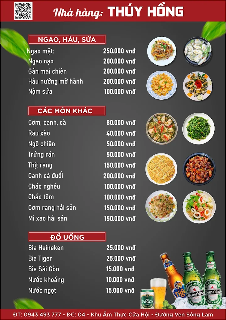 Nhà hàng Thúy Hồng là một địa điểm quen thuộc với du khách và người dân địa phương tại khu vực Cửa Hội, Cửa Lò. Nằm trong Khu ẩm thực Hải Đội trên Đại lộ Ven Sông, nhà hàng chuyên phục vụ các món hải sản tươi sống và ẩm thực Việt với hương vị đậm đà.