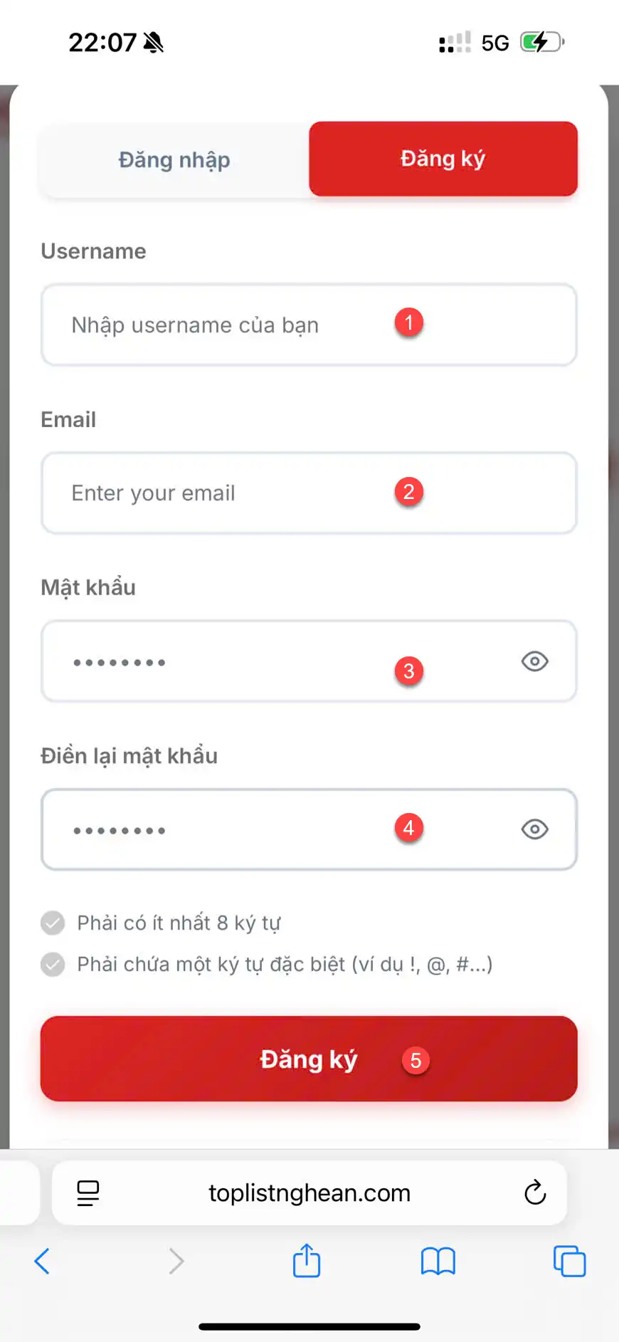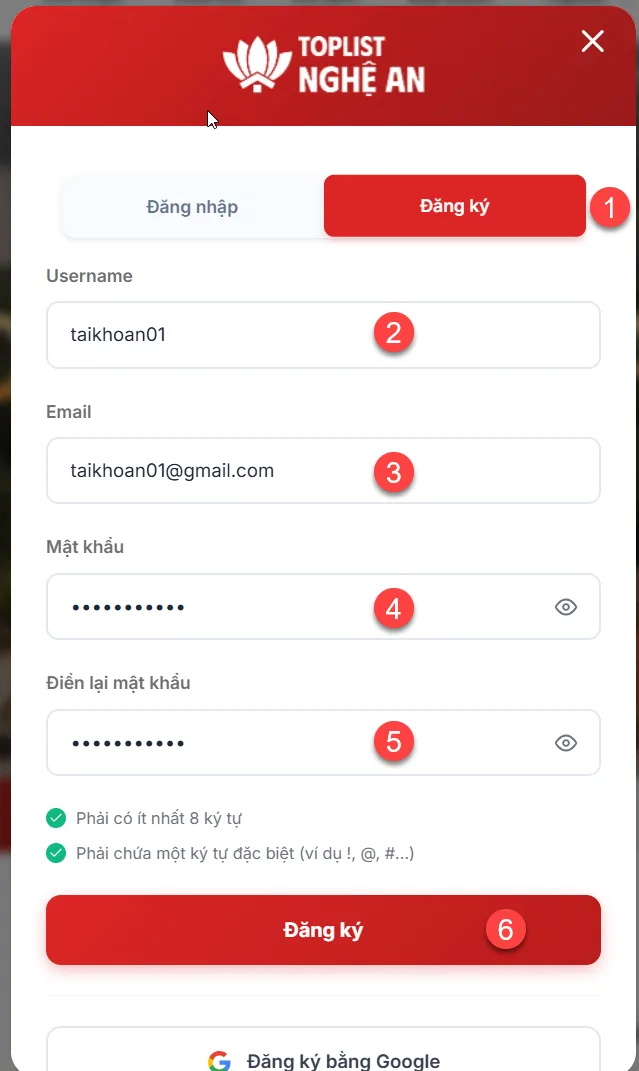1. Bước 1: Truy cập trang chủ website tại toplistnghean.com và click nút “Đăng ký” tại góc phải trên cùng màn hình. 1 Popup giao diện đăng ký sẽ hiện ra.