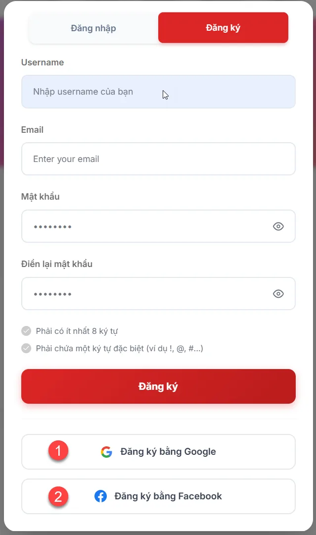 Nếu bạn đã từng sử dụng đăng ký bằng Google hoặc Đăng ký bằng Facebook thì bây giờ các bạn chọn "Đăng nhập bằng Google" hoặc "Đăng nhập bằng Facebook" để tiếp tục trải nghiệm các tính năng tuyệt vời của website.