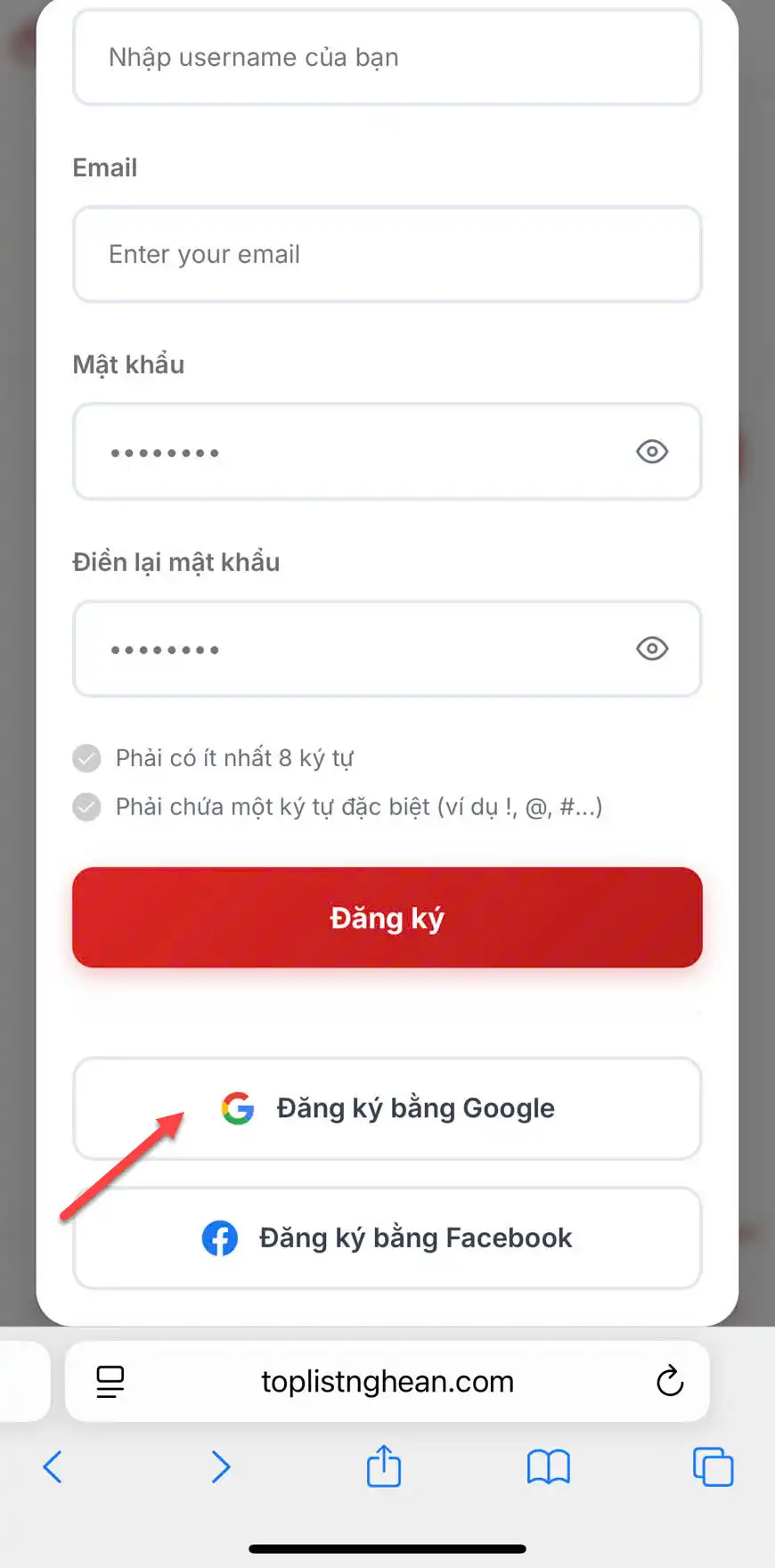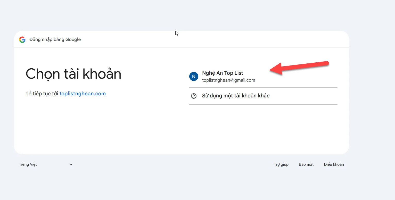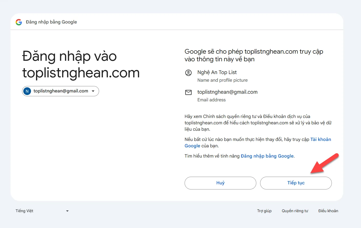 Tương tự “đăng ký bằng Google”, việc đăng ký bằng Facebook các bạn cũng thao tác tương tự và nhập tài khoản facebook và mật khẩu vào để đăng ký tài khoản toplistnghean.com
