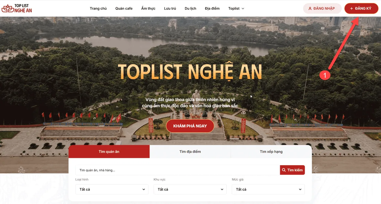 1. Bước 1: Truy cập trang chủ website tại toplistnghean.com và click nút “Đăng ký” tại góc phải trên cùng màn hình.
