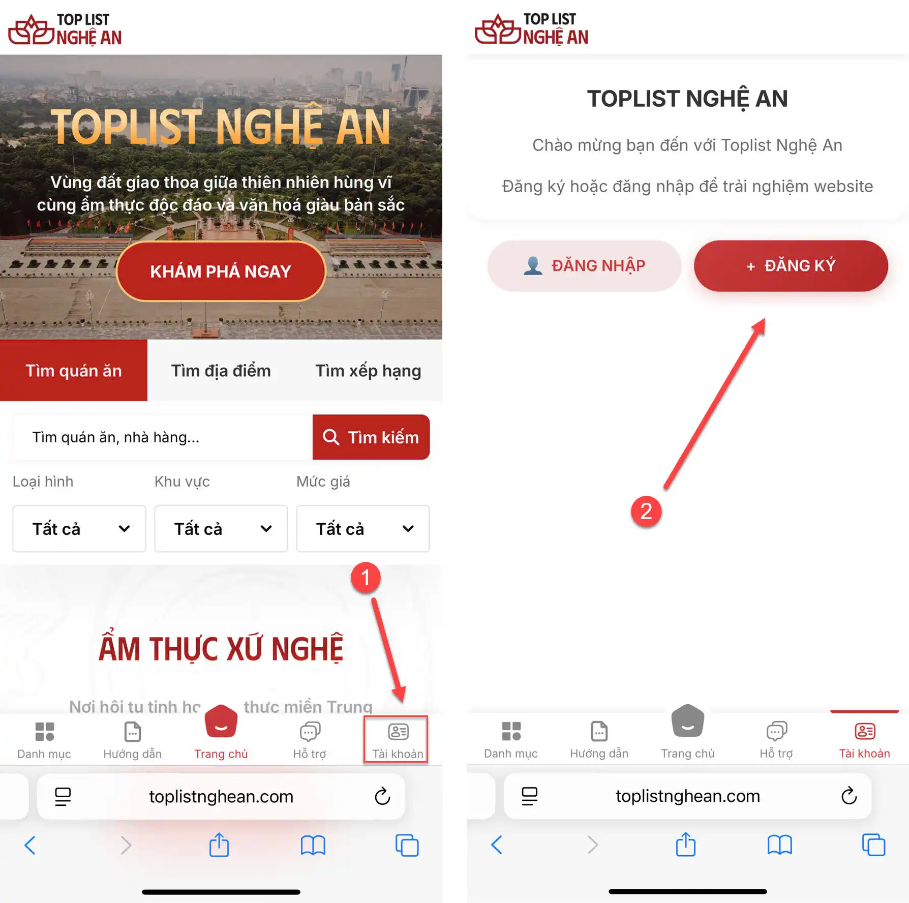 Bước 1: Ở màn hình trang chủ website toplistnghean.com, các bạn bấm vào nút "Tài khoản" ở góc phải dưới cùng màn hình và chọn "Đăng ký".