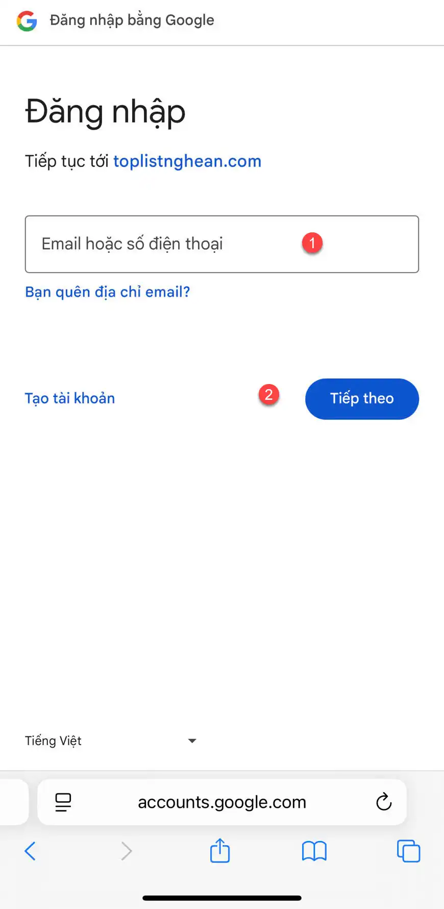 Bước 3: Màn hình sẽ chuyển qua trình đăng nhập của Google, bạn chỉ cần nhập email, điền mật khẩu vào là đã có tài khoản trên Toplistnghean.com