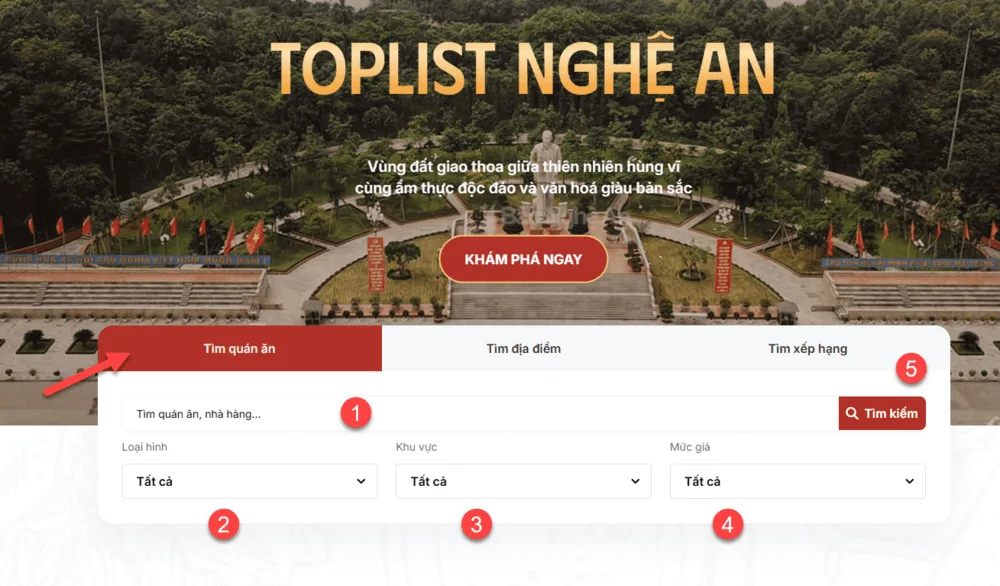 Chào mừng các bạn đến với topic "Hướng dẫn tra cứu/tìm kiếm trên website Toplistnghean.com". Tại đây chúng sẽ hướng dẫn các bạn tìm kiếm mọi thông tin về địa điểm, nhà hàng/quán ăn, khách sạn, homestay hay các địa điểm vui chơi trên địa bàn toàn tỉnh. Bắt đầu thôi.