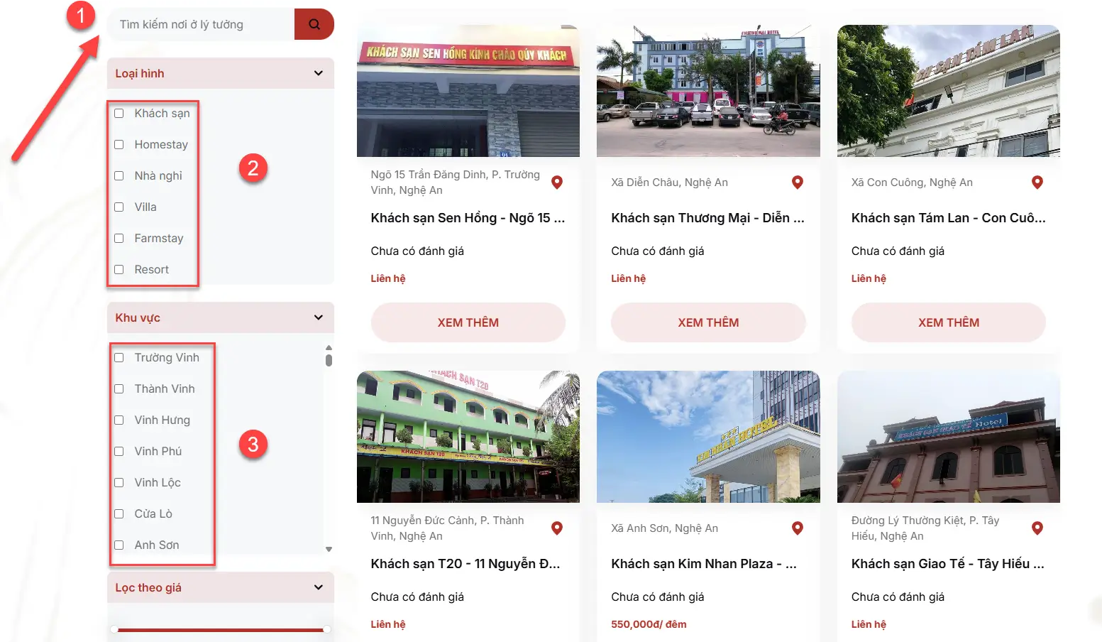 Bước 2: Nhập tên địa điểm Lưu trú bạn cần tìm thông tin thì nhập vào ô tìm kiếm số 1 như hình dưới hoặc nếu bạn cần tìm các khách sạn, nhà nghỉ khu vực nào đó thì chọn số 2 hoặc số 3 như hình dưới