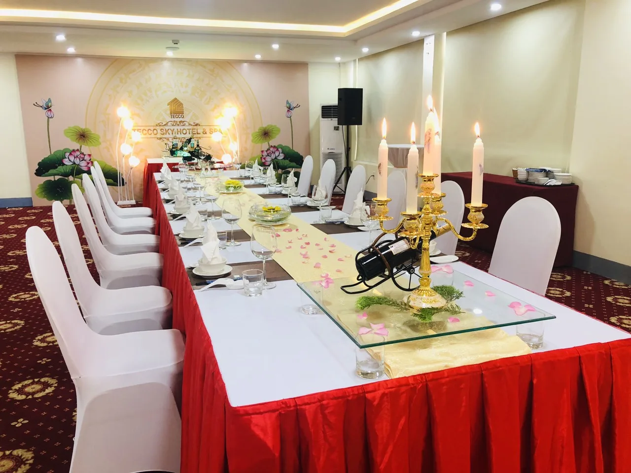 Tecco Sky & Spa là khách sạn 3 sao tọa lạc tại trung tâm Vinh, Nghệ An mang đến trải nghiệm nghỉ dưỡng tiện nghi và thư giãn cho khách hàng. Với vị trí thuận lợi, khách sạn nằm gần các điểm tham quan và khu vực mua sắm nên sẽ là địa điểm lý tưởng cho cả khách du lịch và công tác. Khách sạn Tecco Sky Hotel có hệ thống phòng nghỉ sang trọng, đầy đủ tiện nghi cùng các dịch vụ đa dạng như nhà hàng, quầy bar, spa và phòng hội họp.