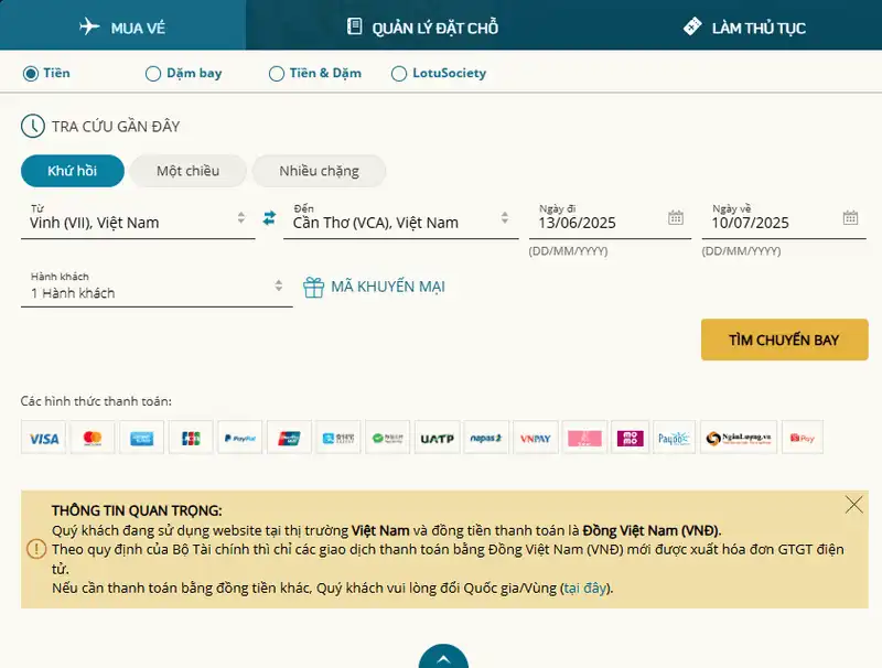 Bạn có thể đặt vé máy bay từ Vinh đi Cần Thơ một cách dễ dàng qua nhiều hình thức khác nhau, tùy theo nhu cầu và sự tiện lợi: