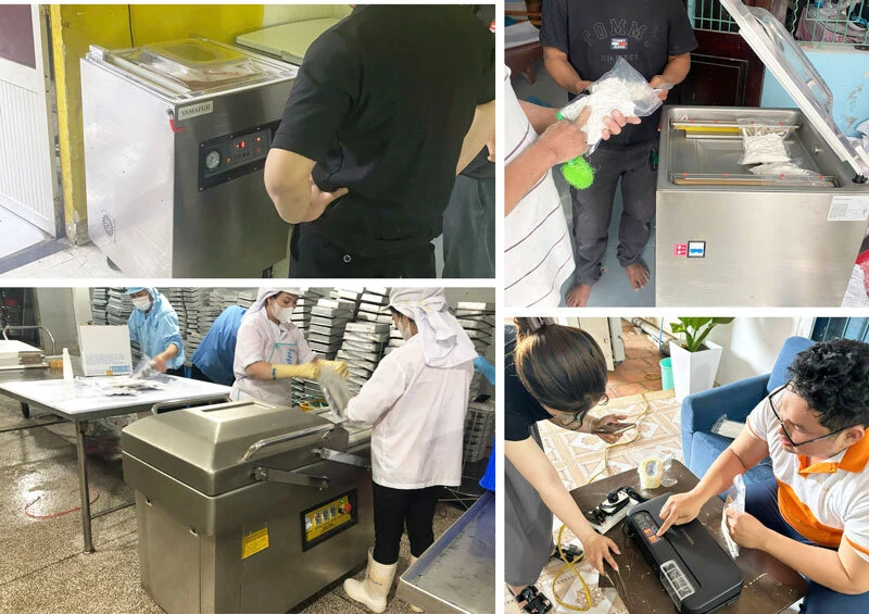 Hoàn toàn được. Tại các cửa hàng chuyên dụng như Hải Minh, NewSun hay Hữu Phát, nhân viên luôn khuyến khích khách hàng mang mẫu sản phẩm thực tế (giò, lươn, gạo...) đến để hút thử. Điều này giúp bạn kiểm tra xem máy có hút kiệt không, đường hàn có đẹp và chắc chắn với loại túi bạn đang dùng hay không.