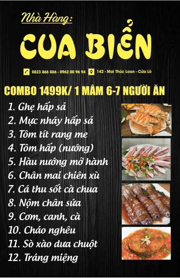 1. Loại hình: Nhà Hàng Cua Biển là một nhà hàng chuyên về hải sản, tập trung mang đến cho thực khách những món ăn được chế biến từ nguồn hải sản tươi sống đánh bắt trong ngày tại vùng biển Cửa Lò.