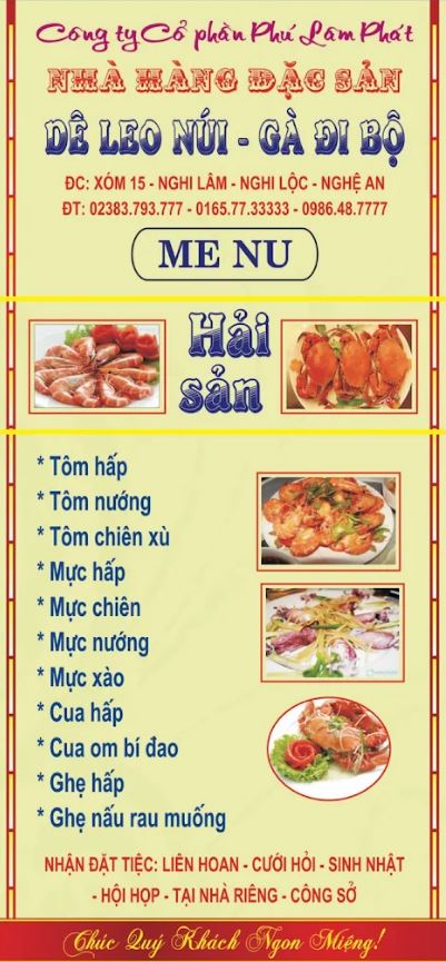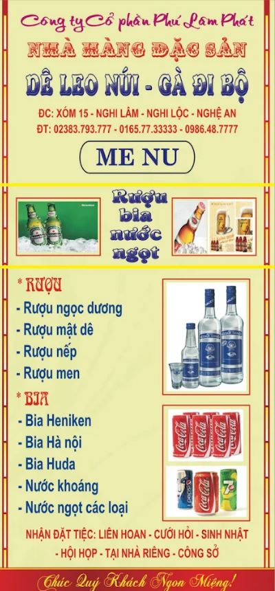 Nhà hàng Dê Leo Núi - Gà Đi Bộ là điểm đến lý tưởng cho những ai muốn thưởng thức các món đặc sản từ dê núi và gà đồi tươi ngon tại Nghi Lộc. Nhà hàng được đánh giá cao về chất lượng món ăn, dịch vụ nhiệt tình, chu đáo và không gian rộng rãi, thoáng mát, mang đến những trải nghiệm ẩm thực đáng nhớ cho thực khách.