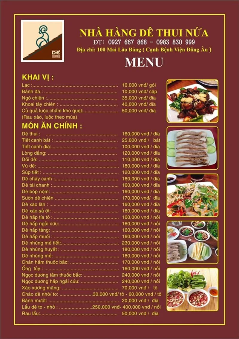 Với thực đơn chuyên sâu và đa dạng về đặc sản thịt dê, Nhà hàng Dê Thui Nứa là một địa chỉ không thể bỏ qua cho những ai mê mẩn hương vị này. Từ những món nhậu quen thuộc đến các món lẩu, món tần bổ dưỡng, tất cả đều hứa hẹn mang đến một trải nghiệm ẩm thực đậm đà và chất lượng.