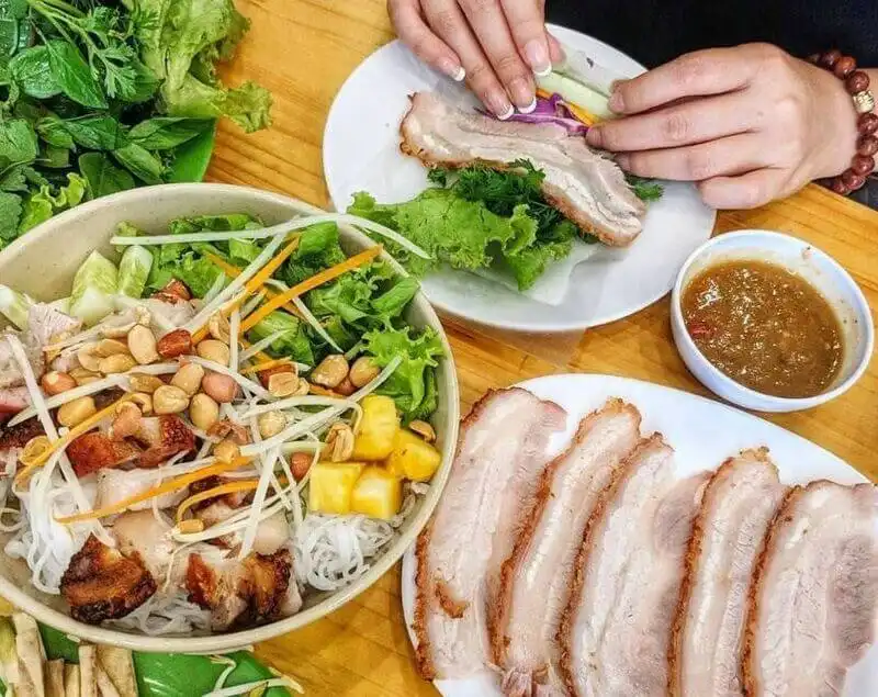 Thịt heo quay giòn bì hoặc luộc mềm được thái lát to bản, đẹp mắt. Điểm cộng lớn nhất là mẹt rau sống "siêu to khổng lồ" với đủ loại xà lách, tía tô, xoài xanh... Cuốn tất cả trong lớp bánh tráng phơi sương và chấm vào bát mắm nêm pha chuẩn vị, bạn sẽ cảm nhận được sự bùng nổ của vị giác.