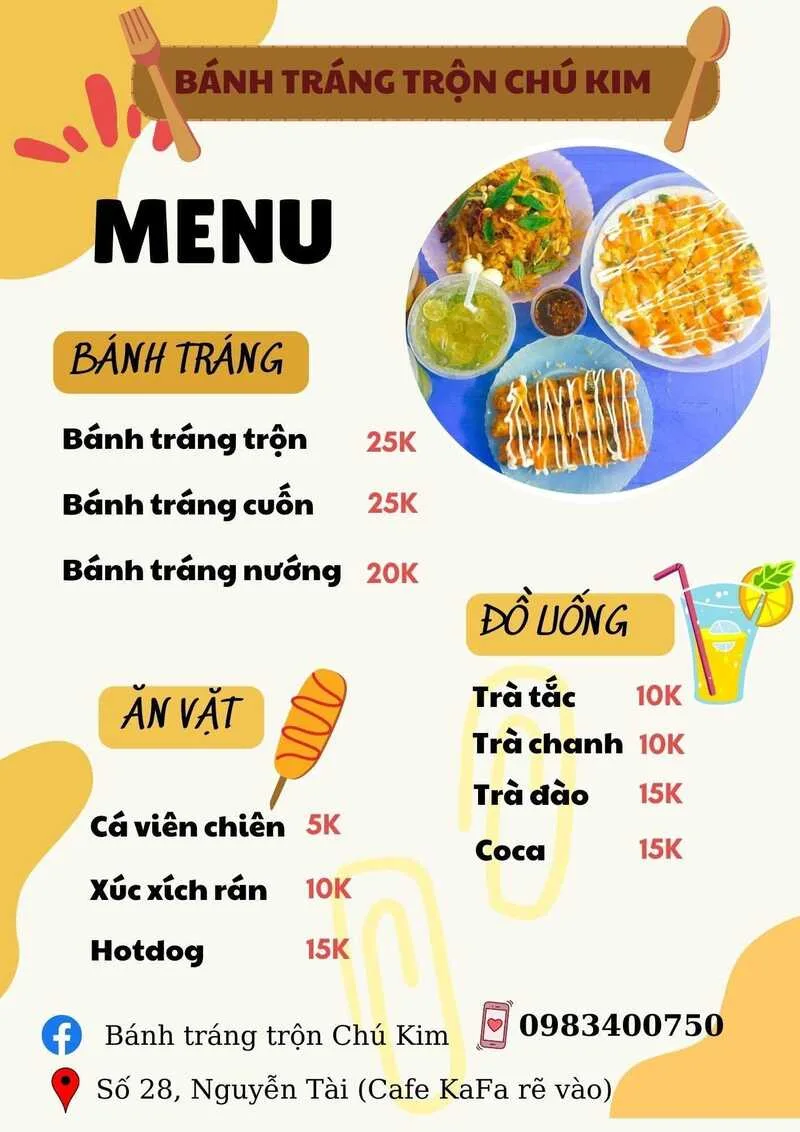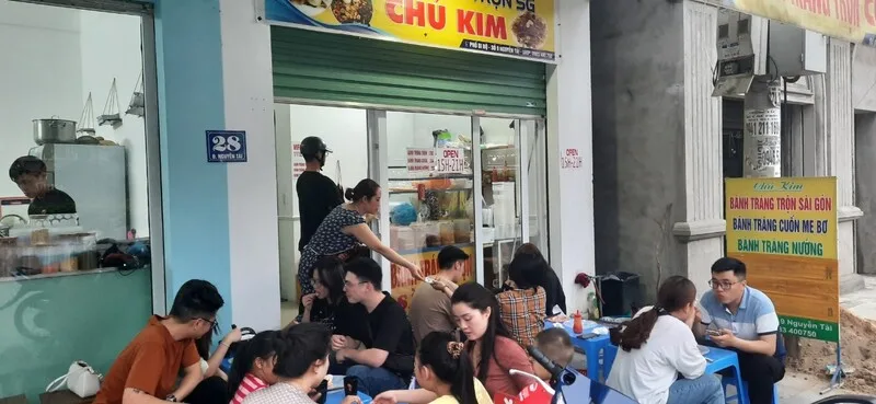 Là một địa chỉ "ruột" của các tín đồ ăn vặt, Bánh tráng trộn Chú Kim mang đến hương vị bánh tráng Sài Gòn đích thực. Với không gian vỉa hè quen thuộc, thực đơn đa dạng các loại bánh tráng từ trộn, cuốn đến nướng và mức giá cực kỳ học sinh, đây là điểm hẹn lý tưởng để "lấp đầy chiếc bụng đói" sau giờ tan học.