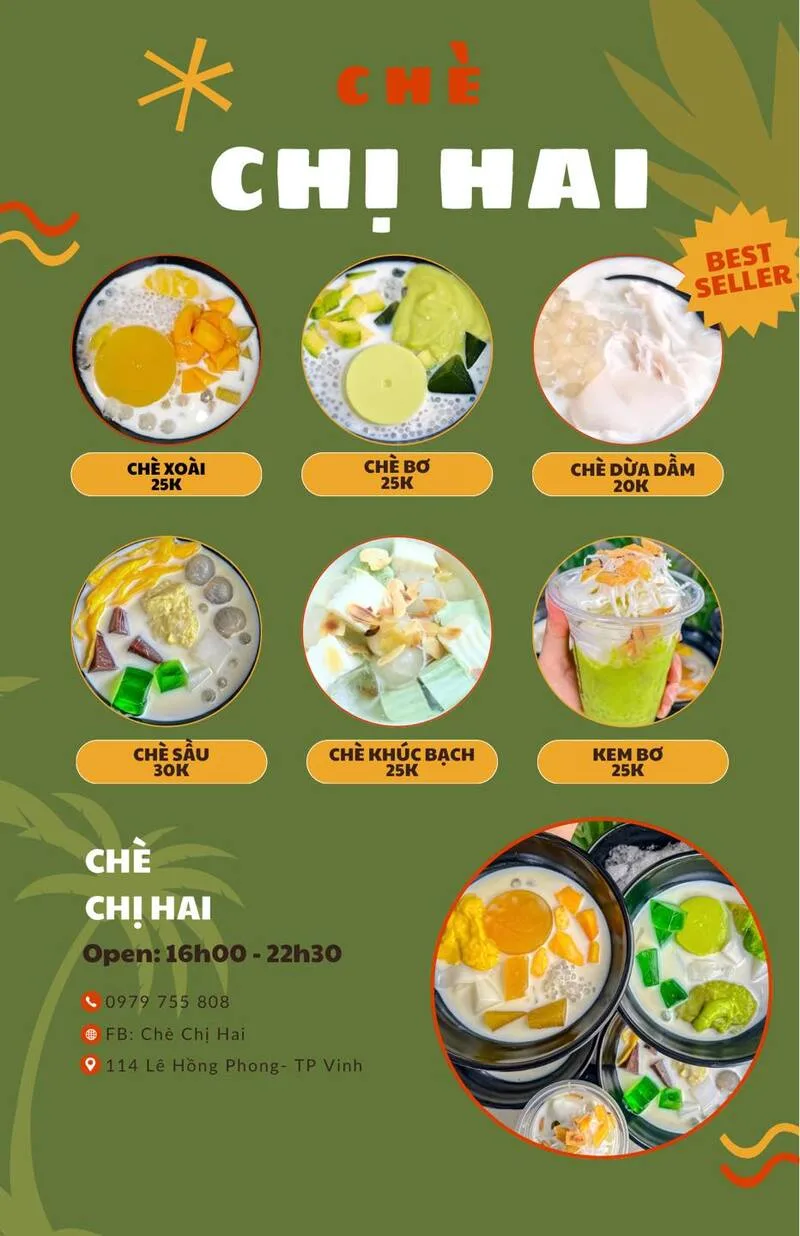 Với những cốc chè "núng nính" topping, vị ngọt mát vừa phải và giá cả hợp lý, Chè Chị Hai là một lựa chọn hoàn hảo để giải nhiệt. Nếu bạn đang tìm kiếm một ly chè bơ béo ngậy hay một cốc chè xoài tươi mát, hãy ghé ngay 114 Lê Hồng Phong.