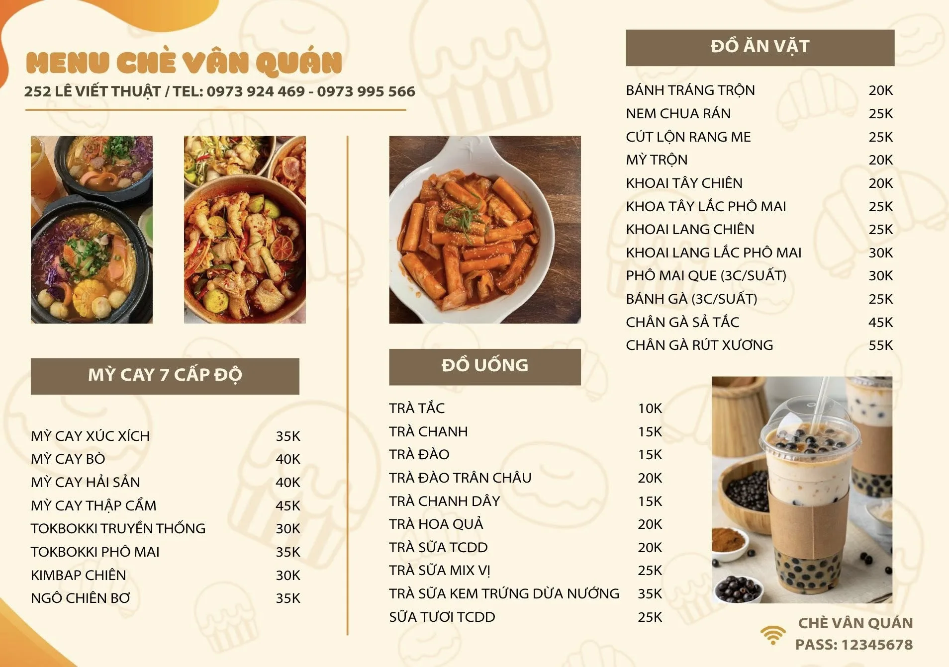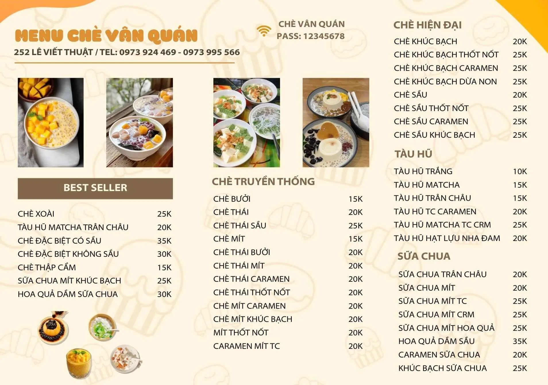 Với thực đơn phong phú hơn 40 món chè và đồ ăn vặt, cùng các món đặc trưng như sữa chua mít và caramen, Chè Vân Quán là một địa chỉ quen thuộc. Đây là một lựa chọn phù hợp cho những ai tìm kiếm một món tráng miệng đa dạng và hấp dẫn.