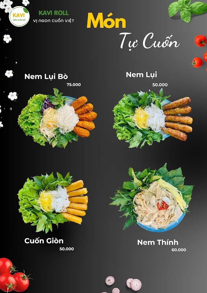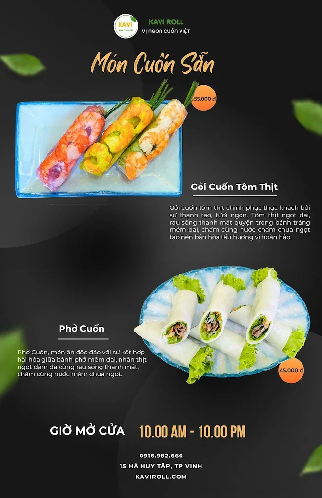 Với Slogan "Vị ngon cuốn Việt", Kavi Roll là một điểm đến tinh tế dành cho các tín đồ món cuốn tại Vinh. Tọa lạc tại 15 Hà Huy Tập, quán chuyên phục vụ các món cuốn, cuộn đa dạng, nổi bật với nước mắm nêm chuẩn vị Đà Nẵng. Đặc biệt, Kavi Roll còn "gây thương nhớ" với thực đơn bánh sầu riêng béo ngậy cực kỳ hấp dẫn.