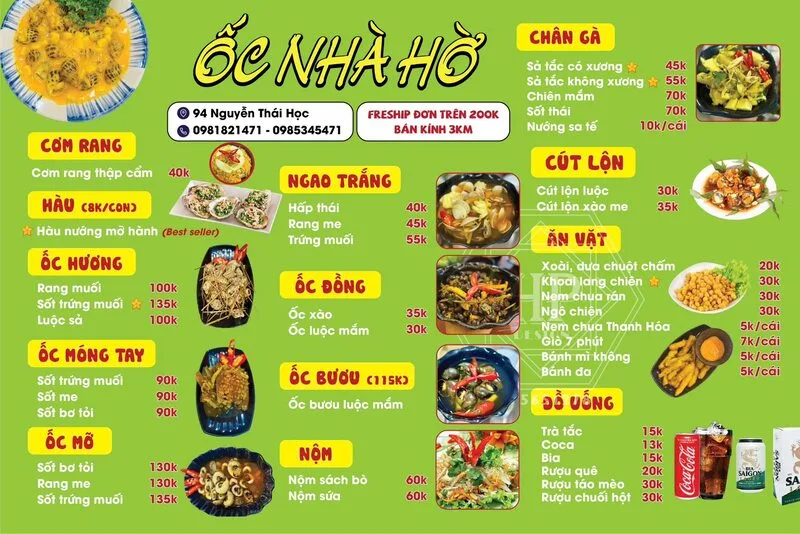 Với một thực đơn đồ sộ, đáp ứng mọi nhu cầu về ốc và các món ăn vặt, cùng không khí thân thiện, gần gũi, Ốc Nhà Hờ xứng đáng là một trong những quán ốc hàng đầu tại Vinh. Nếu bạn đang tìm một nơi để "chill" cùng bạn bè bên những đĩa ốc ngon, đây chắc chắn là một lựa chọn hoàn hảo.