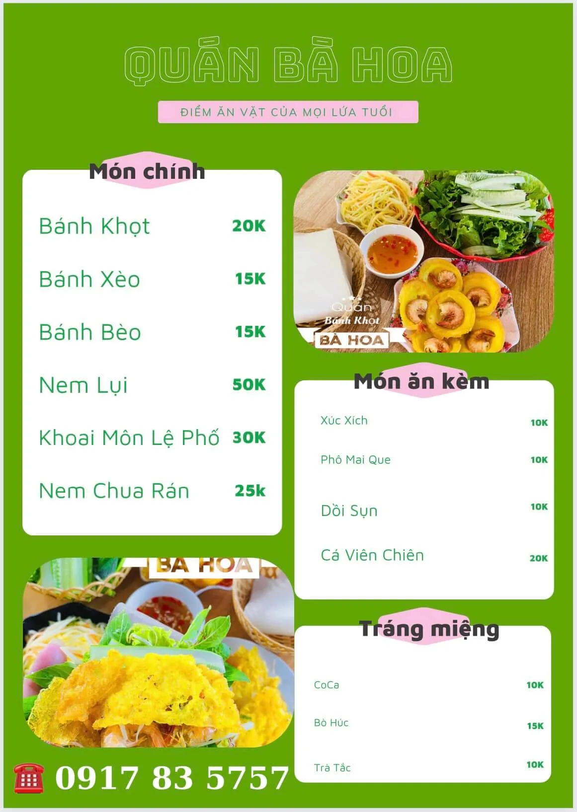 Quán bánh khọt Bà Hoa là một quán ăn vặt và ăn sáng được nhiều người yêu thích tại thị trấn Quỳ Hợp. Nổi tiếng với các món bánh khọt, bánh xèo, nem lụi cùng bánh canh Lào, quán thu hút thực khách bởi hương vị truyền thống thơm ngon và mức giá phải chăng. Đây là địa điểm lý tưởng cho những ai muốn thưởng thức các món ăn dân dã, đậm đà hương vị quê hương.