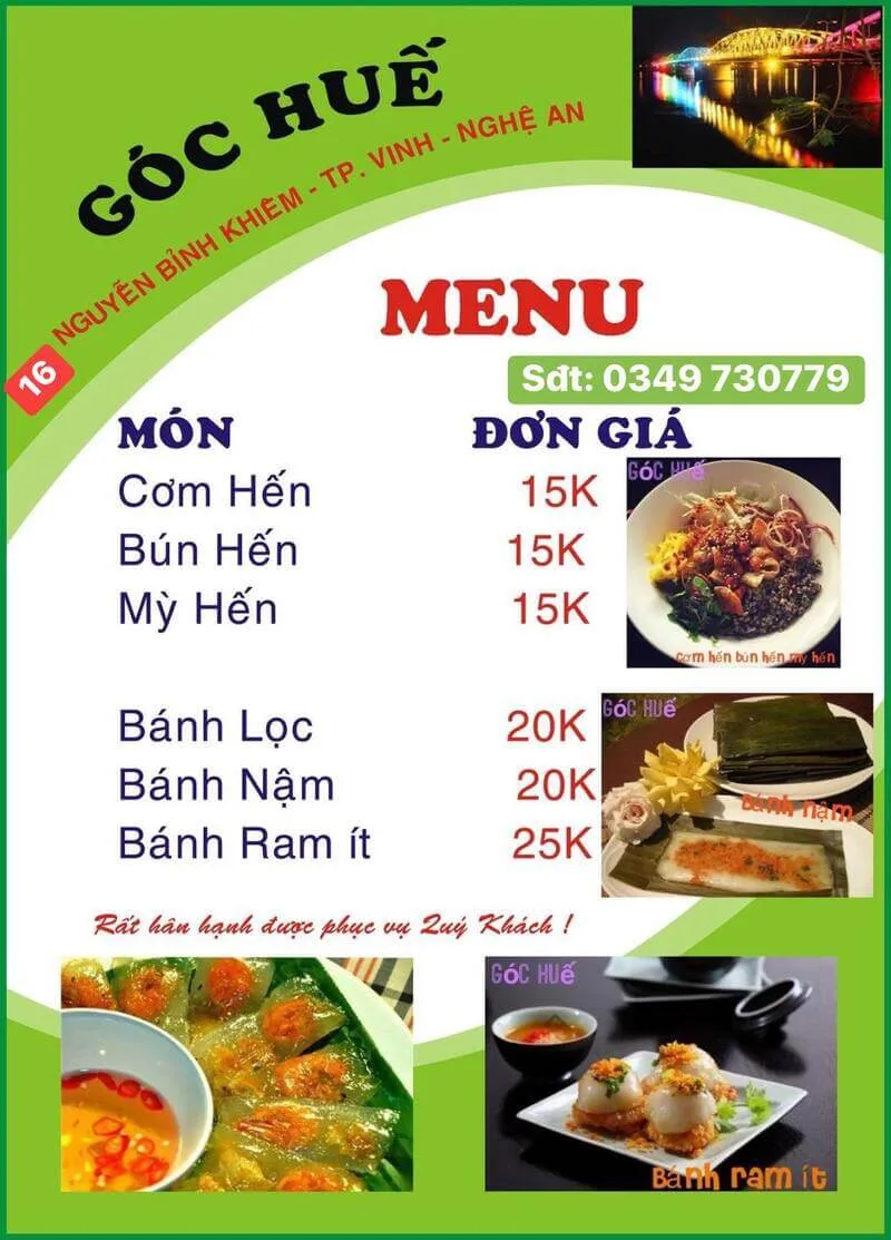 Quán Góc Huế đã thành công trong việc mang trọn vẹn hương vị tinh tế của ẩm thực Cố đô đến với người dân Vinh. Với thực đơn phong phú, chất lượng món ăn đồng đều và một không gian gần gũi, đây là địa chỉ lý tưởng để bạn cùng gia đình và bạn bè thưởng thức những món ngon đặc sản của Huế bất kỳ lúc nào.