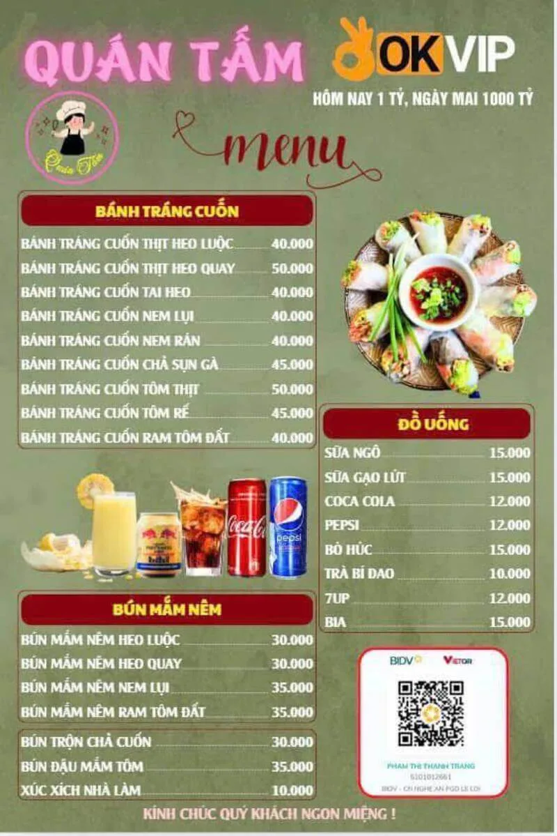Với món mắm nêm được pha chế theo công thức riêng và các suất ăn đầy đặn, Quán Tấm là một lựa chọn cho những ai muốn thưởng thức một bữa ăn trọn vị trong một không gian thoáng đãng.